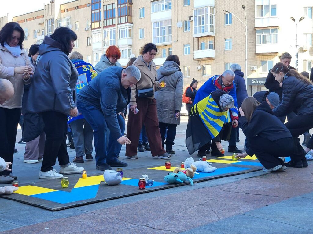 Біля входу до театру запалили лампадки як символ вічної пам’яті про загиблих. Присутні також долучилися до загальнонаціональної хвилини мовчання, вшановуючи жертв російського терору.