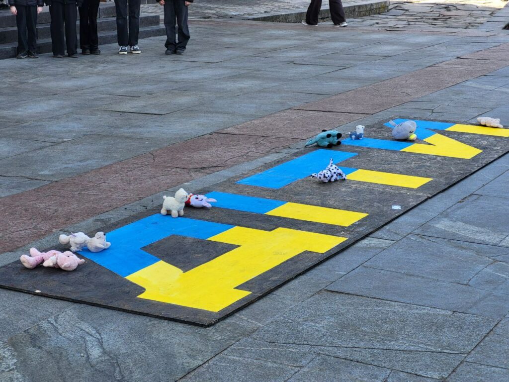 Перед центральним входом до театру учасники відтворили напис «ДІТИ» — символ, який у березні 2022 року був нанесений перед Маріупольським драмтеатром, де переховувалися сотні мирних жителів. Цей напис став всесвітньо відомим знаком надії та водночас трагедії.