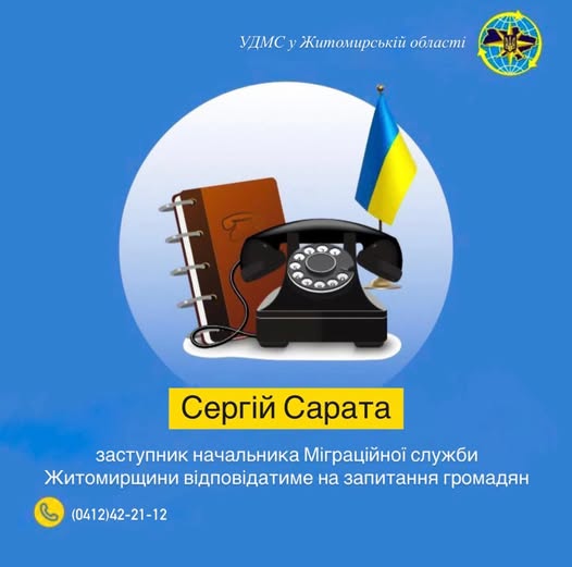 8 січня 2026 року відбудеться особистий прийом дзвінків «гарячої лінії» заступником начальника Управління ДМС у Житомирській області Сергієм Саратою.