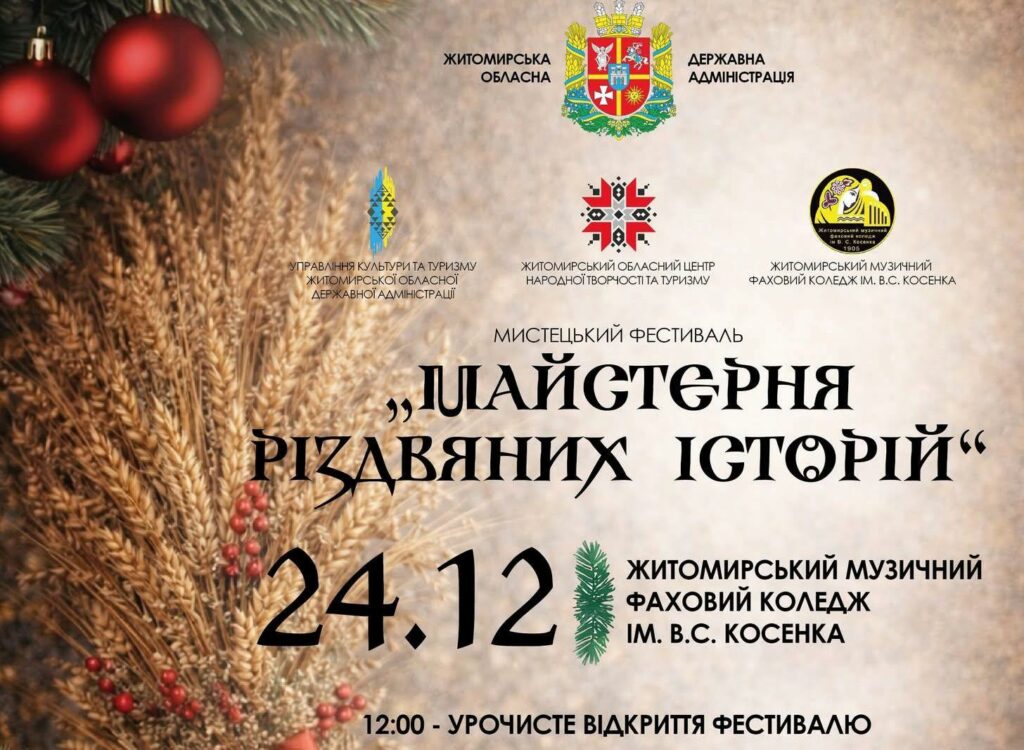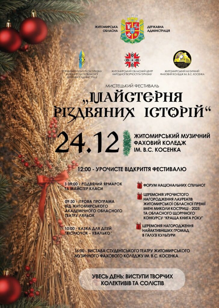 24 грудня Житомир стане простором живої традиції, спільної творчості та щирого різдвяного тепла. Мистецький фестиваль «Майстерня різдвяних історій» об’єднає народну культуру й сучасні мистецькі форми, дитячий сміх, музику та вдячність тим, хто щоденно творить культурне життя Житомирщини.