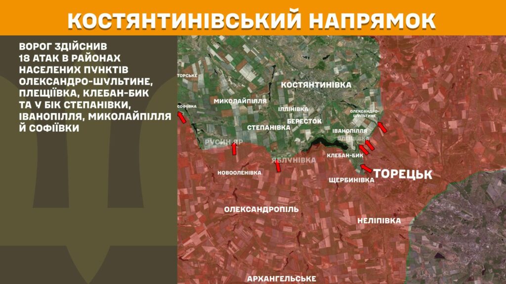 На Костянтинівському напрямку ворог здійснив 18 атак в районах населених пунктів Олександро-Шультине, Плещіївка, Клебан-Бик та у бік Степанівки, Іванопілля, Миколайпілля й Софіївки.