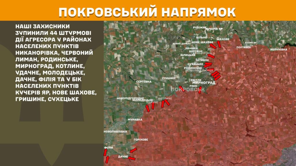 На Покровському напрямку наші захисники зупинили 44 штурмові дії агресора у районах населених пунктів Никанорівка, Червоний Лиман, Родинське, Мирноград, Котлине, Удачне, Молодецьке, Дачне, Філія та у бік населених пунктів Кучерів Яр, Нове Шахове, Гришине, Сухецьке.