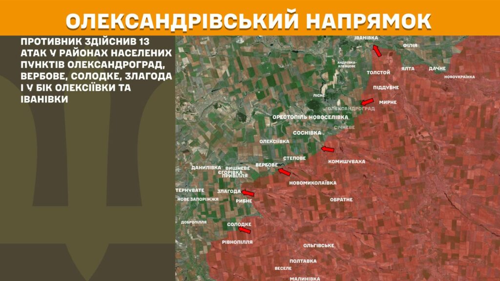На Олександрівському напрямку противник вчора здійснив 13 атак у районах населених пунктів Олександроград, Вербове, Солодке, Злагода і у бік Олексіївки та Іванівки.