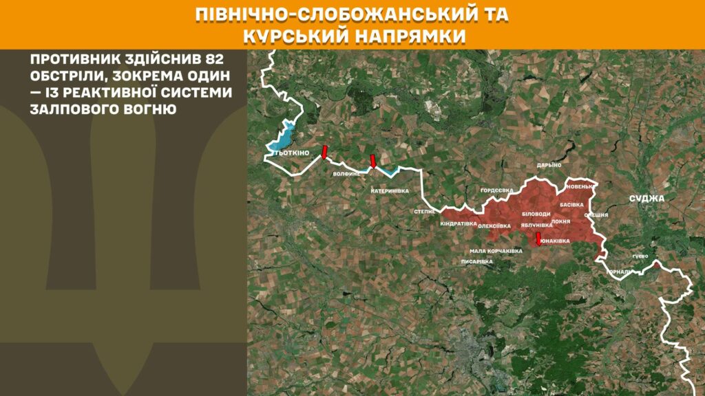 На Північно-Слобожанському і Курському напрямках минулої доби відбулося три боєзіткнення. Противник завдав трьох авіаційних ударів, скинув вісім керованих авіаційних бомб та здійснив 82 обстріли, зокрема один — із реактивної системи залпового вогню.