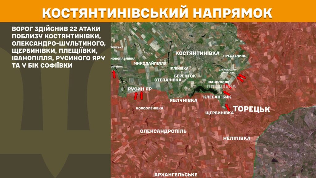На Костянтинівському напрямку ворог здійснив 22 атаки поблизу Костянтинівки, Олександро-Шультиного, Щербинівки, Плещіївки, Іванопілля, Русиного Яру та у бік Софіївки.