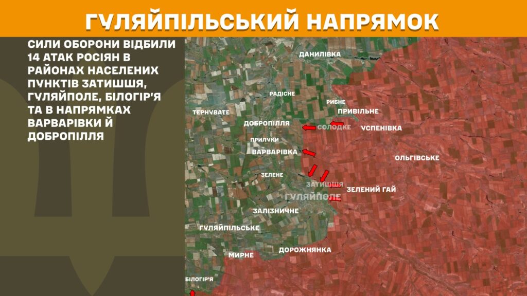 На Гуляйпільському напрямку Сили оборони відбили 14 атак росіян в районах населених пунктів Затишшя, Гуляйполе, Білогір’я та в напрямках Варварівки й Добропілля.