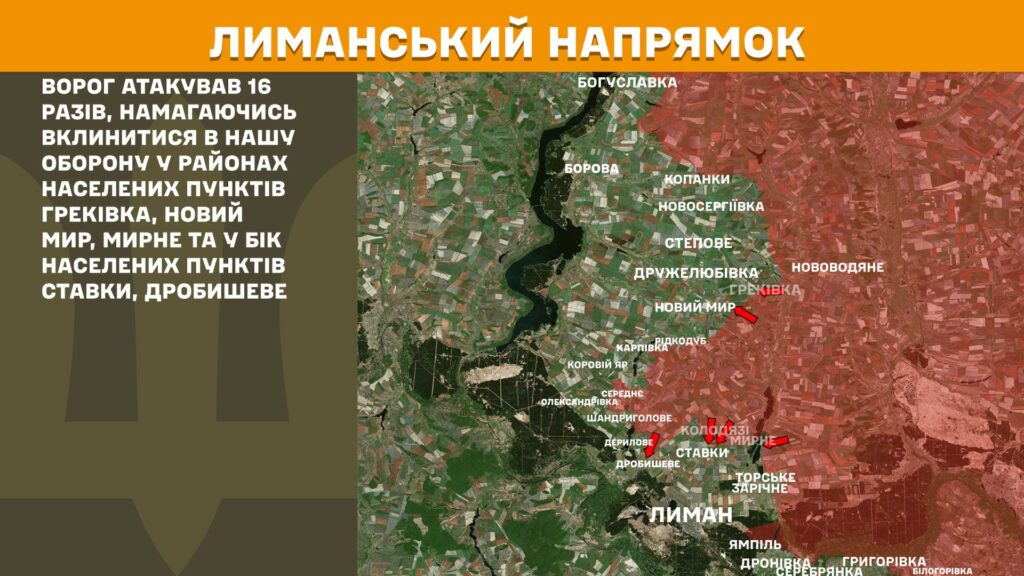 На Лиманському напрямку ворог атакував 16 разів, намагаючись вклинитися в нашу оборону у районах населених пунктів Греківка, Новий Мир, Мирне та у бік населених пунктів Ставки, Дробишеве.