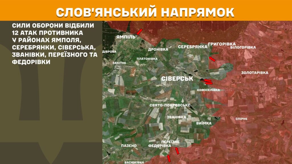 На Слов’янському напрямку Сили оборони відбили 12 атак противника у районах Ямполя, Серебрянки, Сіверська, Званівки, Переїзного та Федорівки.