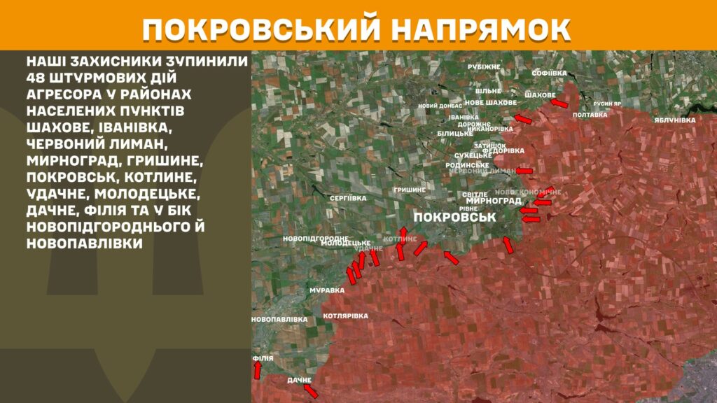 На Покровському напрямку наші захисники зупинили 48 штурмових дій агресора у районах населених пунктів Шахове, Іванівка, Червоний Лиман, Мирноград, Гришине, Покровськ, Котлине, Удачне, Молодецьке, Дачне, Філія та у бік Новопідгороднього й Новопавлівки.