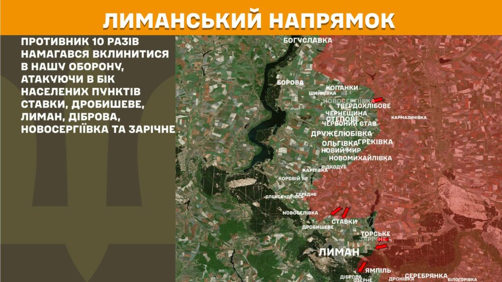 На Лиманському напрямку противник 10 разів намагався вклинитися в нашу оборону, атакуючи в бік населених пунктів Ставки, Дробишеве, Лиман, Діброва, Новосергіївка та Зарічне.