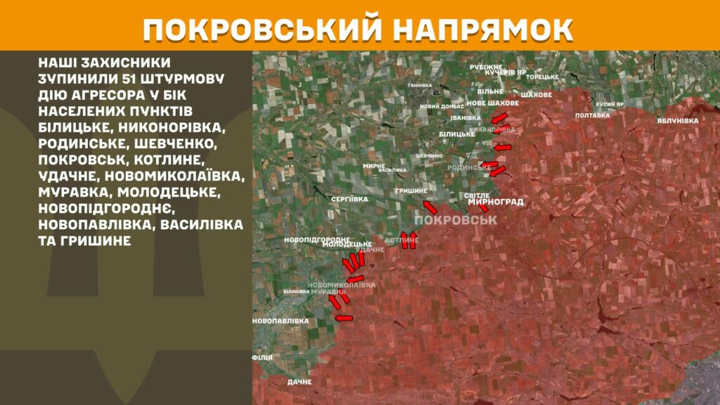 На Покровському напрямку наші захисники зупинили 51 штурмову дію агресора у бік населених пунктів Білицьке, Никонорівка, Родинське, Шевченко, Покровськ, Котлине, Удачне, Новомиколаївка, Муравка, Молодецьке, Новопідгороднє, Новопавлівка, Василівка та Гришине.