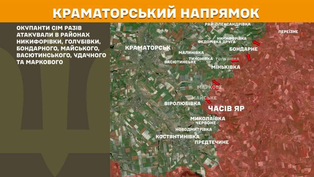На Краматорському напрямку, за уточненою інформацією, окупанти сім разів атакували в районах Никифорівки, Голубівки, Бондарного, Майського, Васютинського, Удачного та Маркового.