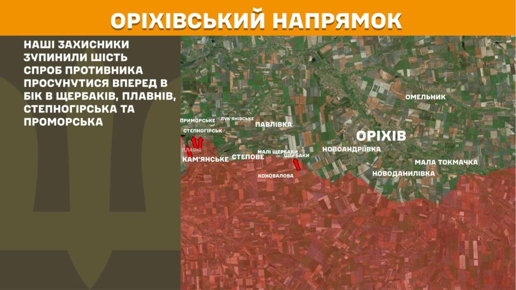 На Оріхівському напрямку наші захисники зупинили шість спроб противника просунутися вперед в бік в Щербаків, Плавнів, Степногірська та Проморська.