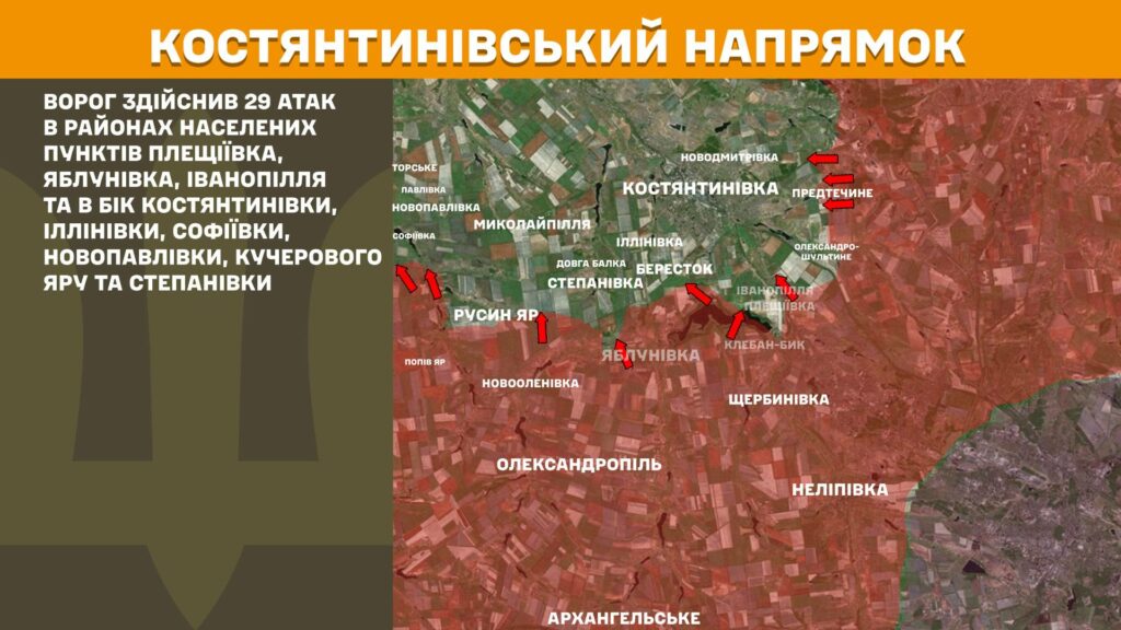 На Костянтинівському напрямку, за уточненою інформацією, ворог здійснив 29 атак в районах населених пунктів Плещіївка, Яблунівка, Іванопілля та в бік Костянтинівки, Іллінівки, Софіївки, Новопавлівки, Кучерового Яру та Степанівки.