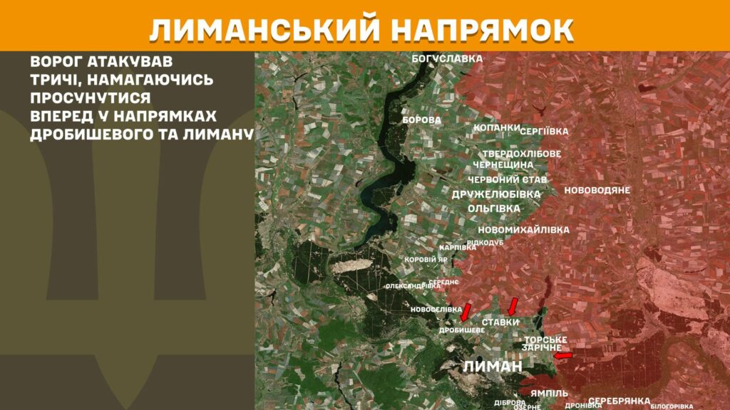 На Лиманському напрямку ворог атакував тричі, намагаючись просунутися вперед у напрямках Дробишевого та Лиману.