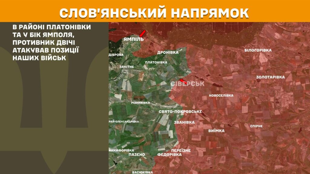 На Слов’янському напрямку, в районі Платонівки та у бік Ямполя, противник двічі атакував позиції наших військ.