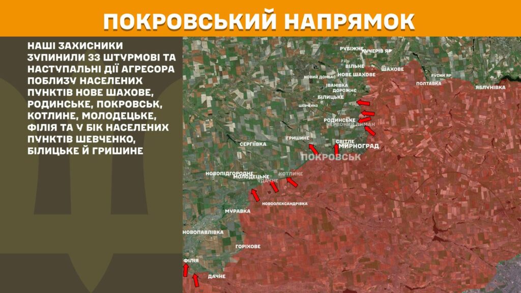На Покровському напрямку наші захисники зупинили 33 штурмові та наступальні дії агресора поблизу населених пунктів Нове Шахове, Родинське, Покровськ, Котлине, Молодецьке, Філія та у бік населених пунктів Шевченко, Білицьке й Гришине.