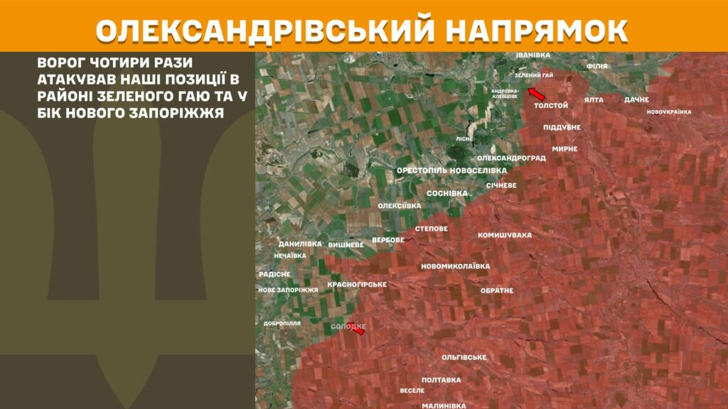 На Олександрівському напрямку ворог чотири рази атакував наші позиції в районі Зеленого Гаю та у бік Нового Запоріжжя.