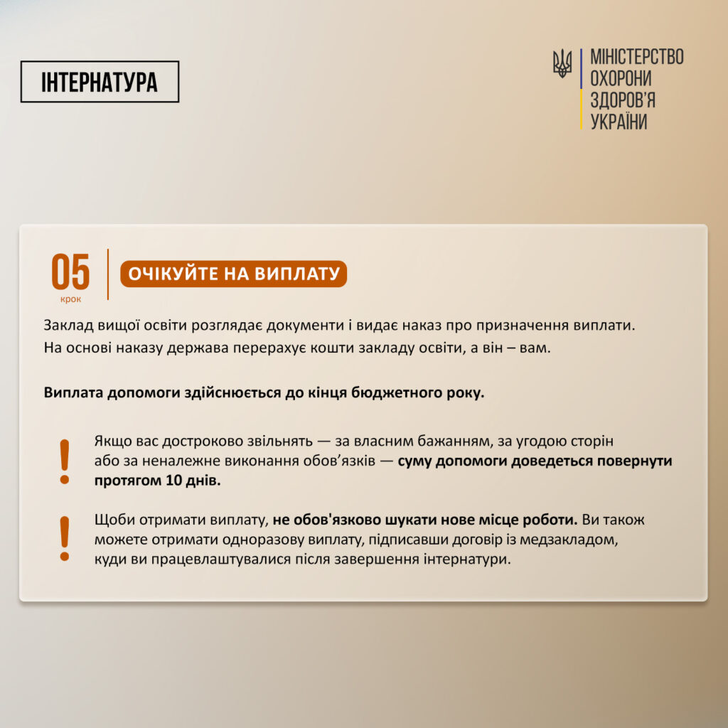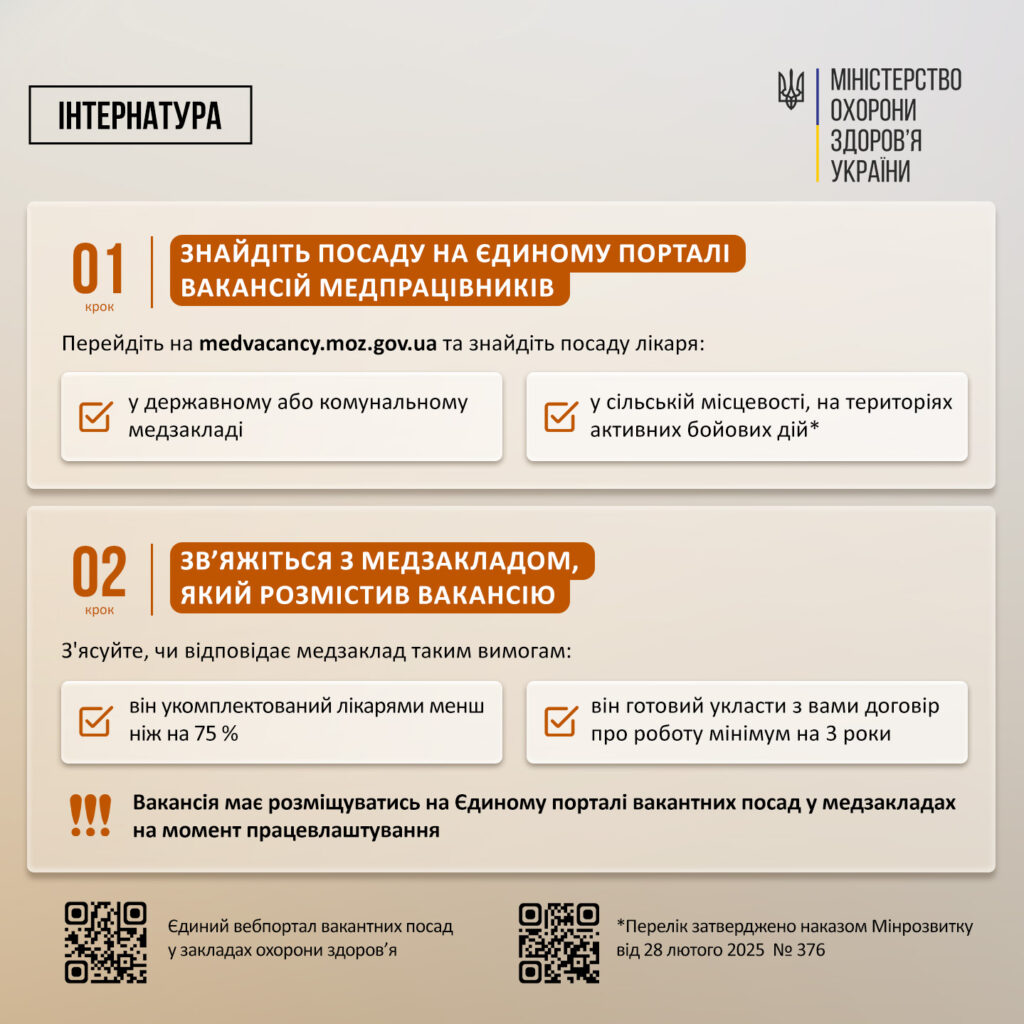 Відповідно до умов програми, лікарі, які починаючи з 2025 року завершили інтернатуру в одному з 20 державних закладів вищої освіти, підпорядкованих Міністерству охорони здоров’я або Міністерству освіти і науки України, можуть отримати одноразову адресну грошову допомогу у розмірі 200 тисяч гривень.