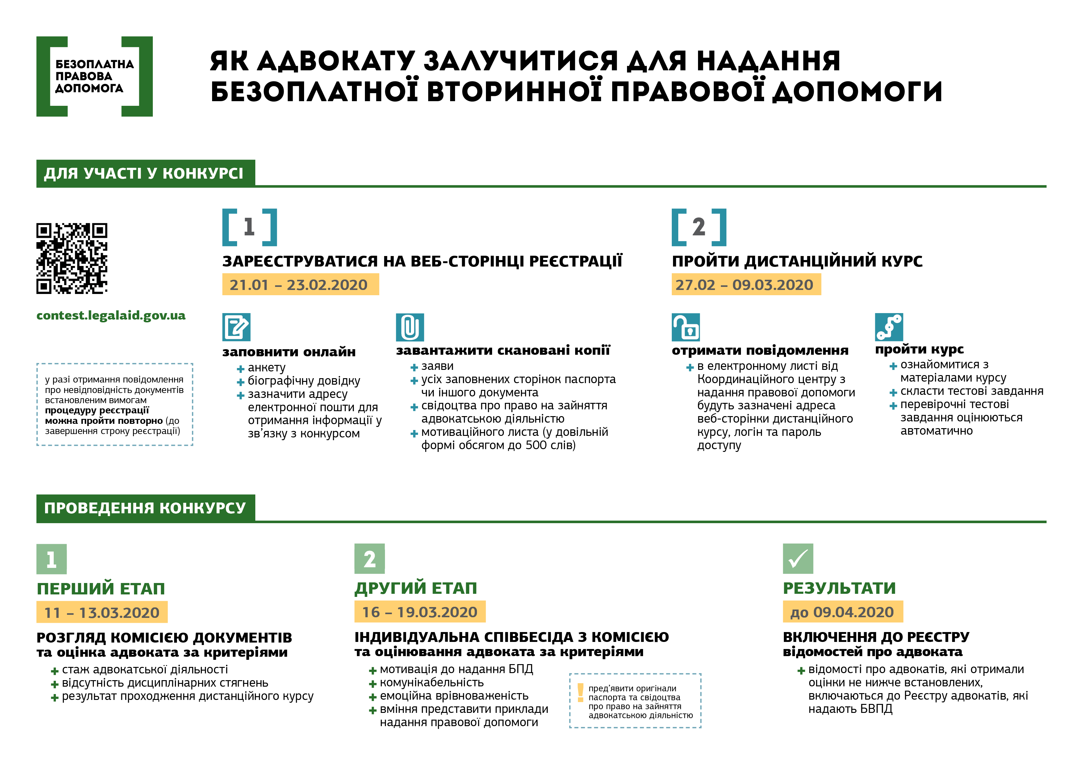 1) Зареєструватися на вебсторінці http://contest.legalaid.gov.ua з 21 січня по 23 лютого 2020 року, де заповнити онлайн анкету та біографічну довідку; зазначити адресу електронної пошти для отримання інформації у зв’язку з конкурсом; завантажити скановані копії заяви, форма якої встановлена Мін’юстом; усіх заповнених сторінок паспорта (чи іншого документа, що посвідчує особу); свідоцтва про право на зайняття адвокатською діяльністю та мотиваційного листа (до 500 слів), складеного у довільній формі.