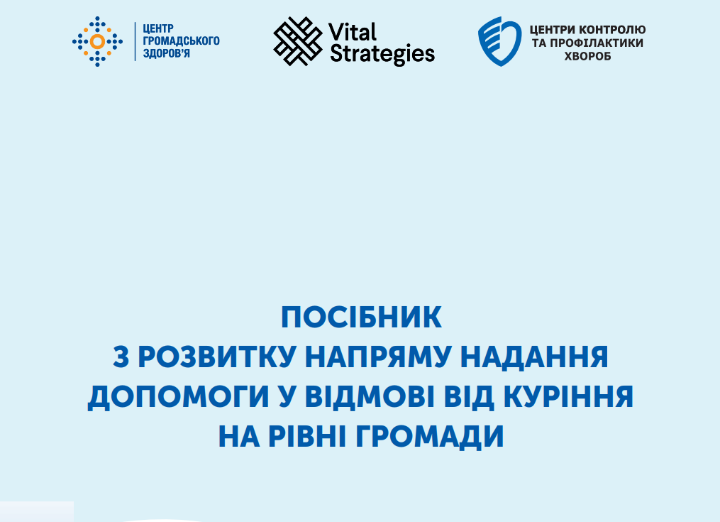 Центр громадського здоров’я МОЗ України (ЦГЗ) за підтримки Vital Strategies, Inc. спільно з експертами з громадського здоров’я при Українському католицькому університеті та лікарями розробив посібник «Розвиток напряму надання допомоги у відмові від куріння на рівні громади» (Посібник). Він призначений для фахівців громадського здоров’я та соціальної роботи, але також буде корисним лідерам громад, освітянам, представникам місцевої влади та всім, хто прагне створювати здорове середовище у своїх громадах.