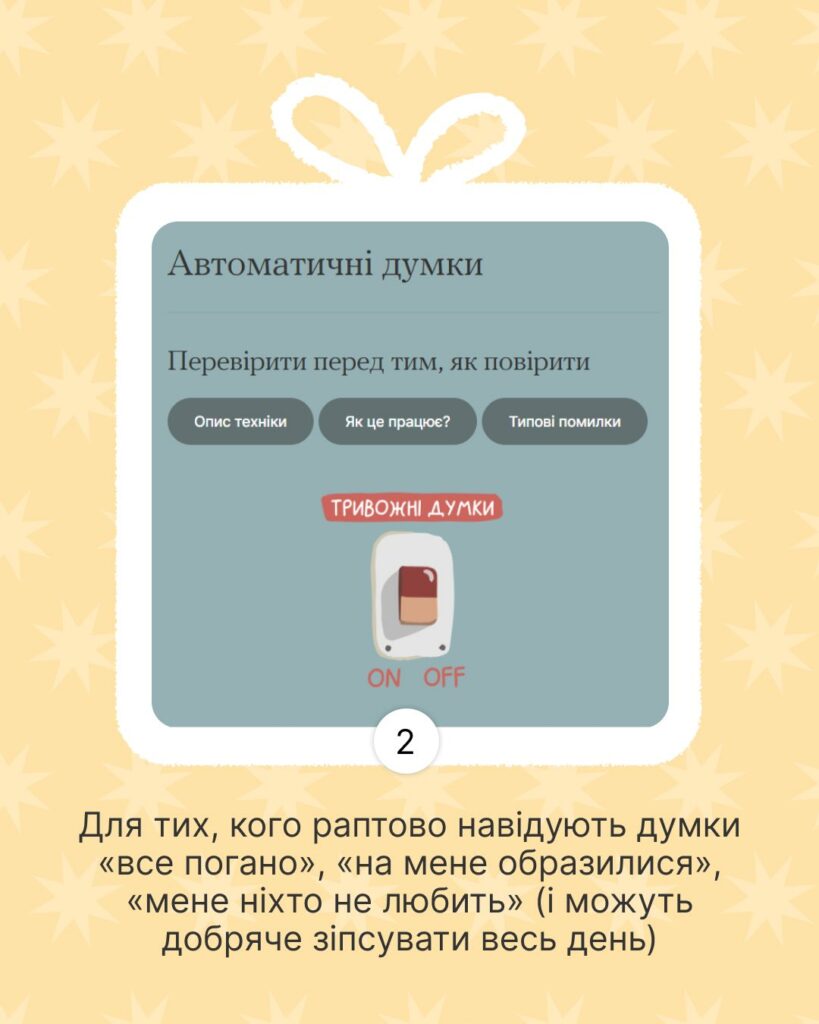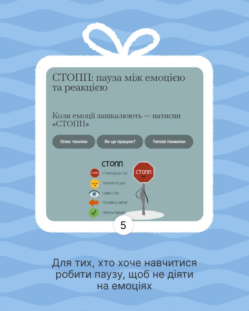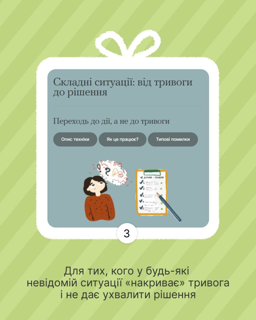 На випадок, якщо захочеш покращити сон, навчитися спілкуватися з іншими спокійно, попрацювати з думками, емоціями та реакціями у стресових ситуаціях.
