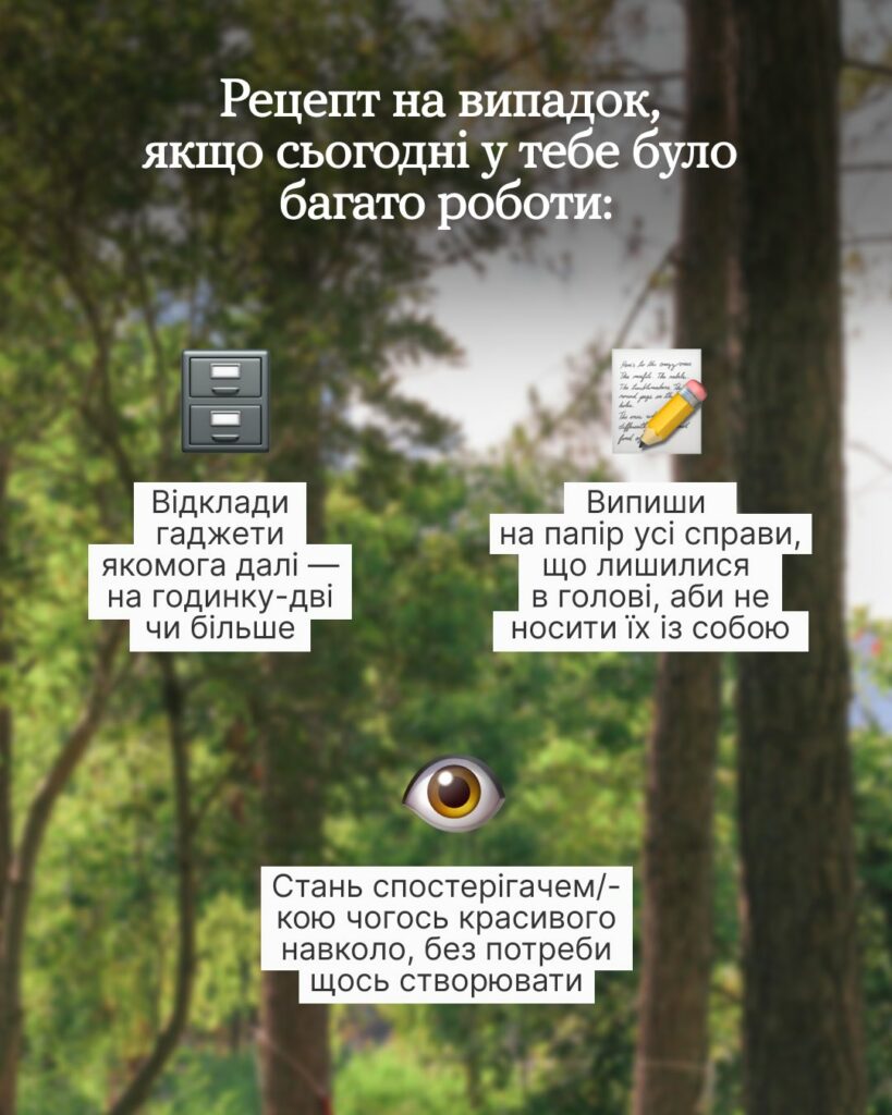 Якщо весь день пройшов за комп’ютером та спілкуванням з людьми, а вечір за гортанням стрічки соцмереж, твій мозок продовжує роботу на високих обертах, просто тепер обробляючи вже іншу інформацію. Тоді як насправді йому потрібна тиша та спокій від контенту.