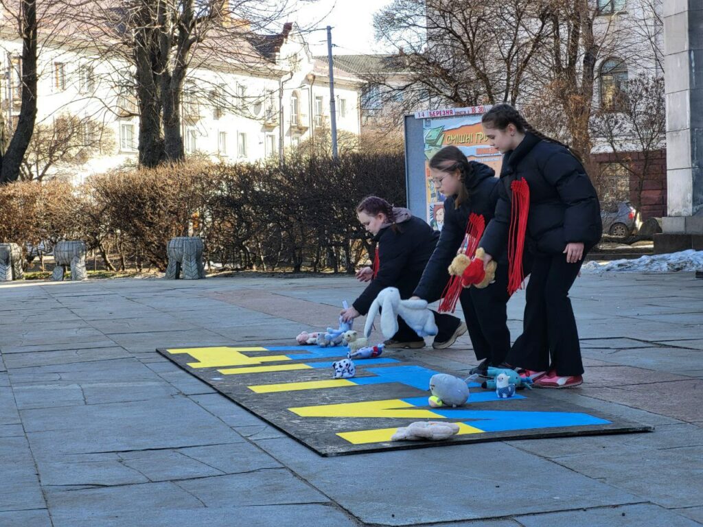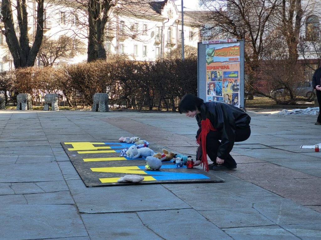 Перед центральним входом до театру учасники відтворили напис «ДІТИ» — символ, який у березні 2022 року був нанесений перед Маріупольським драмтеатром, де переховувалися сотні мирних жителів. Цей напис став всесвітньо відомим знаком надії та водночас трагедії.