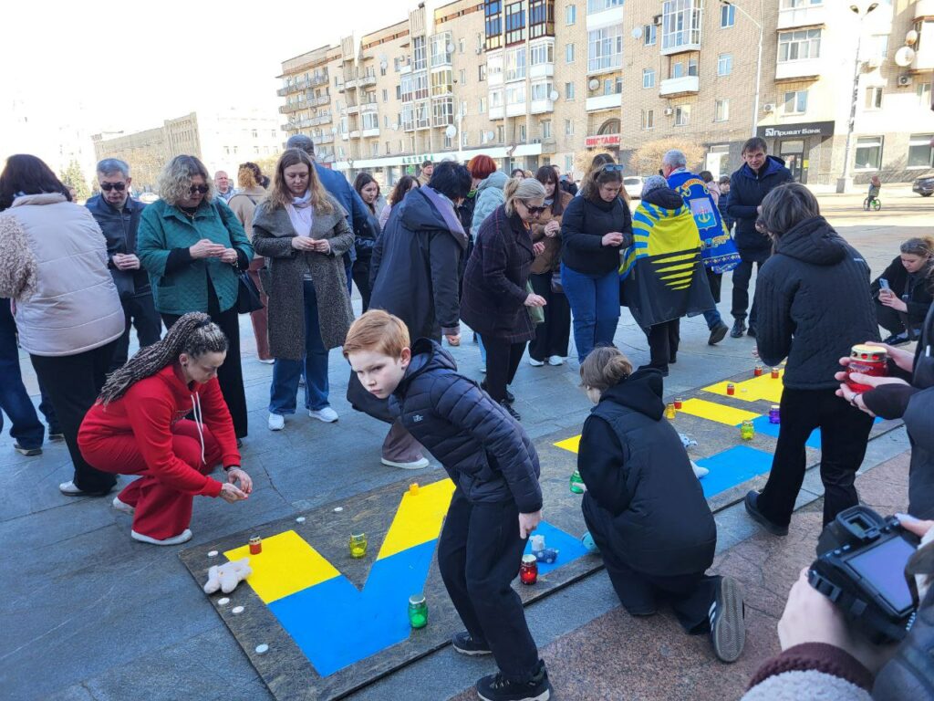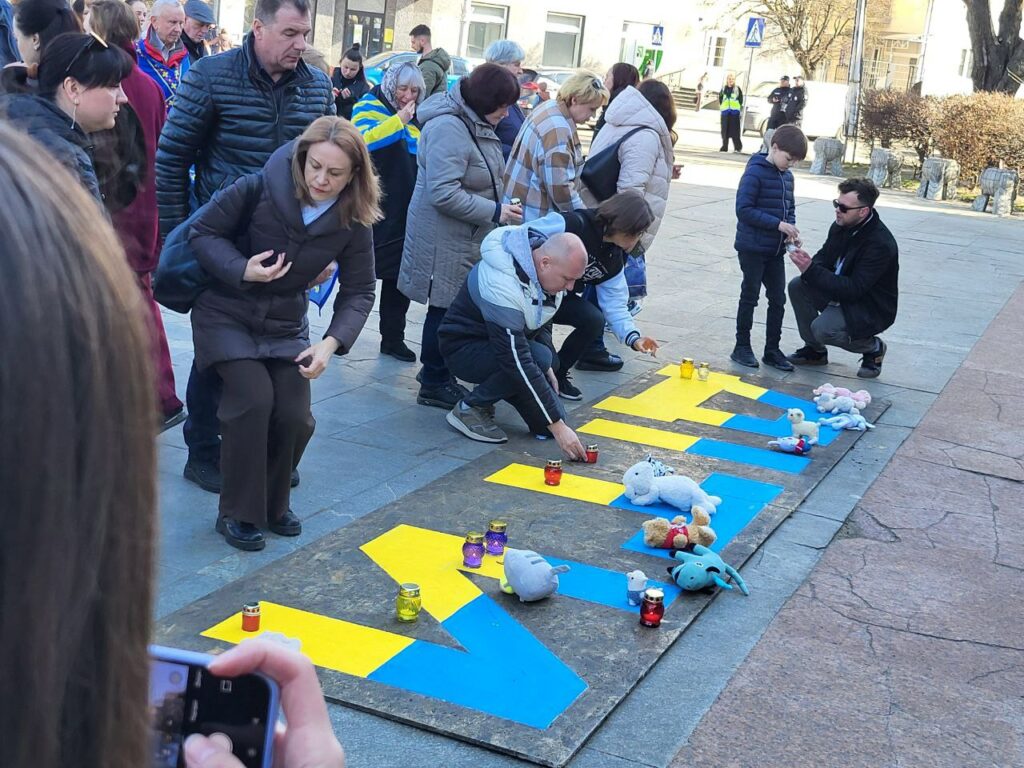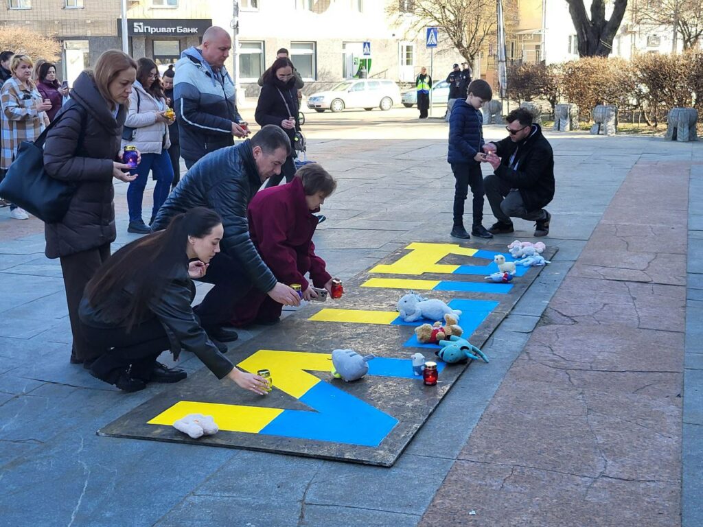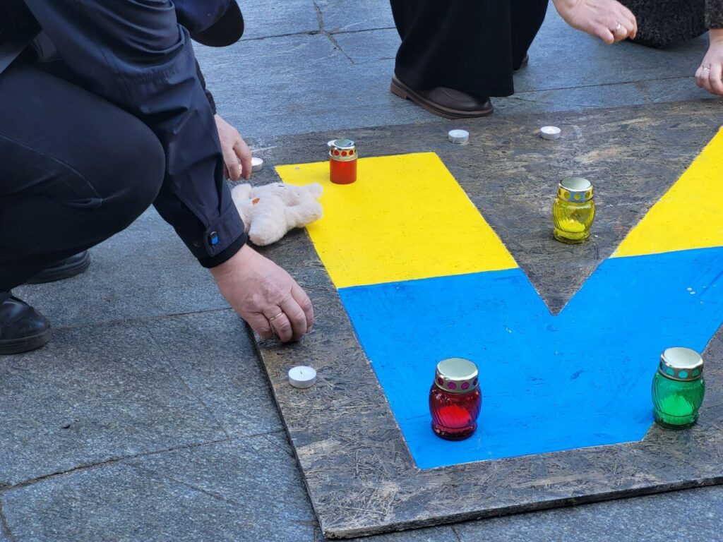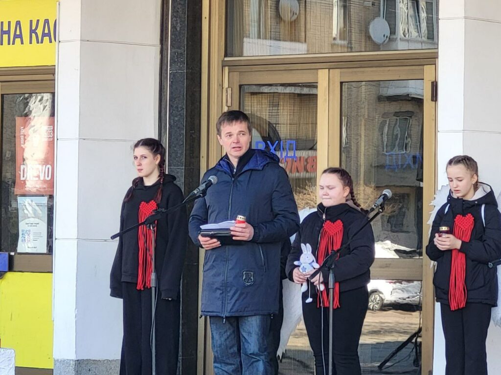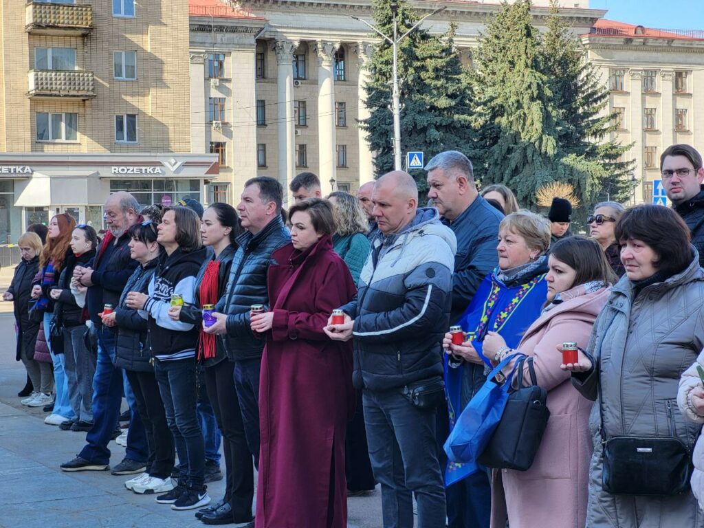 Біля входу до театру запалили лампадки як символ вічної пам’яті про загиблих. Присутні також долучилися до загальнонаціональної хвилини мовчання, вшановуючи жертв російського терору.
