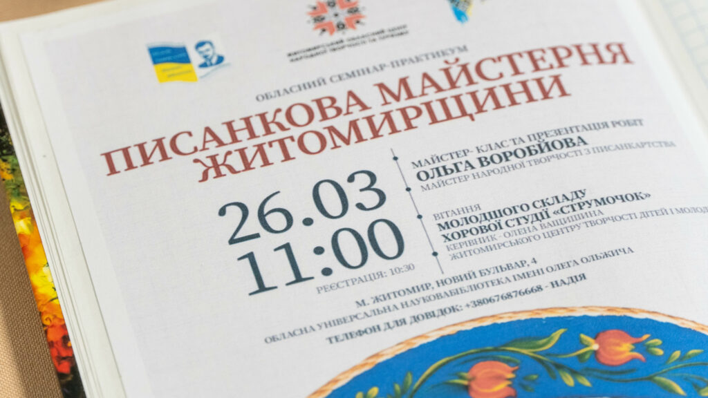 26 березня у Житомирській обласній універсальній науковій бібліотеці імені Олега Ольжича відбувся творчий захід — майстер-клас із писанкарства «Писанкова майстерня Житомирщини». Захід організовано за участі Центру народної творчості. Подія об’єднала всіх охочих долучитися до українських великодніх традицій і спробувати власноруч створити писанку.