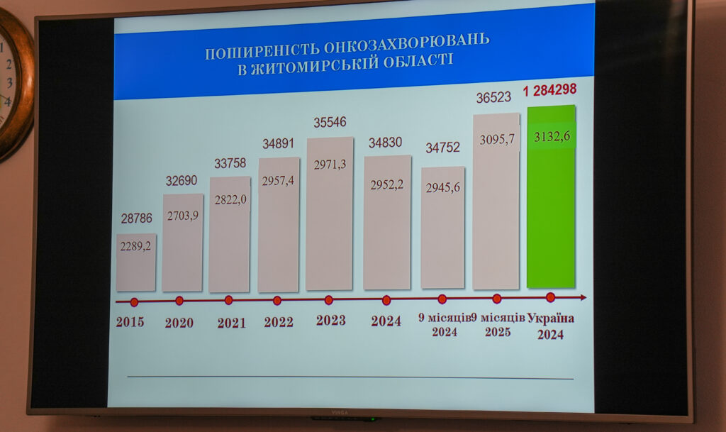 За інформацією КНП «Житомирський обласний онкологічний диспансер», станом на 30 вересня 2025 року на онкологічному обліку перебуває 36 523 пацієнти, що становить близько 3 095,7 на 100 тисяч населення області. Захворюваність у Житомирській області за 9 місяців 2025 року склала 236,6 на 100 тисяч населення, при цьому було виявлено 2 791 новий випадок онкологічних захворювань, що дещо нижче порівняно з аналогічним періодом минулого року.