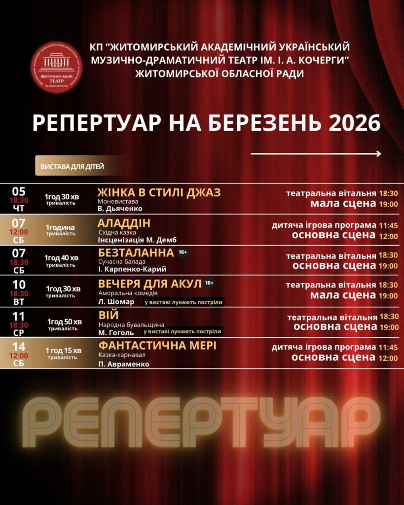Житомирський академічний український музично-драматичний театр імені Івана Кочерги запрошує на вистави у березні
