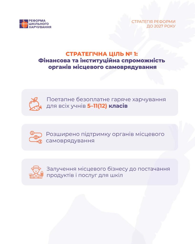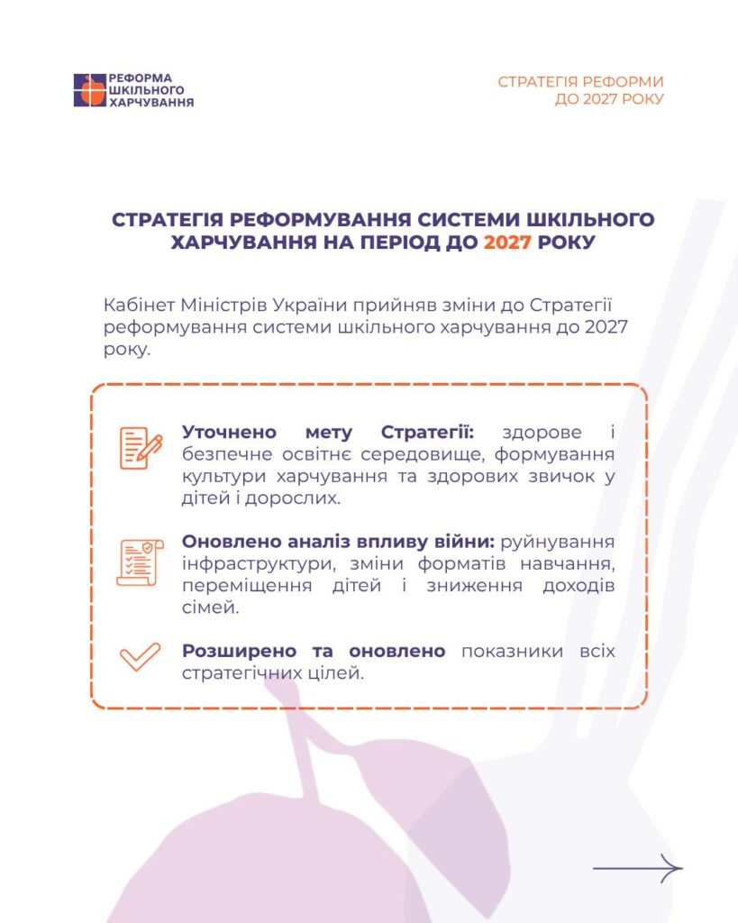 Реформа шкільного харчування формує новий підхід до учнівських обідів і ставлення до їжі в Україні. Її мета – щоб кожна дитина мала доступ до якісних, безпечних і збалансованих страв, а культура здорового харчування стала частиною повсякденного життя сімей.