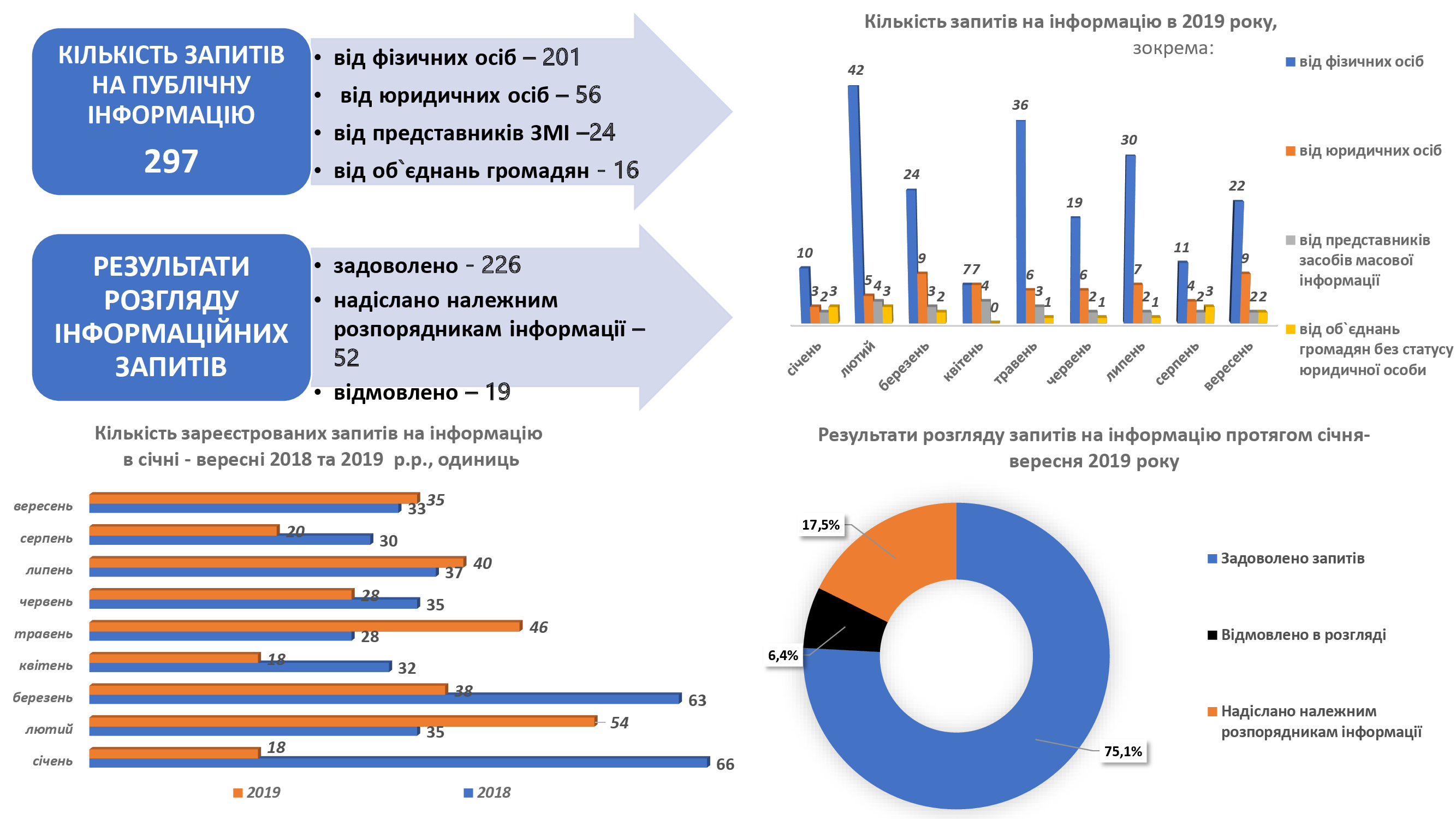 За 9 місяців 2019 року до Житомирської обласної державної адміністрації надійшло 297 запитів на інформацію у яких порушено 721 питання, що на 17,3% менше ніж у відповідному періоді 2018 року (359 запитів). Серед них: від фізичних осіб – 201 запит; від юридичних осіб – 56 запитів; від представників засобів масової інформації – 24 запити; від об`єднань громадян без статусу юридичної особи – 16 запитів.